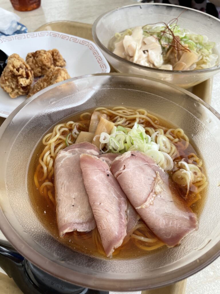 夏だったので冷やしラーメンもありました!唐揚げもあったので、遊園地の中から早速お酒が進みます。